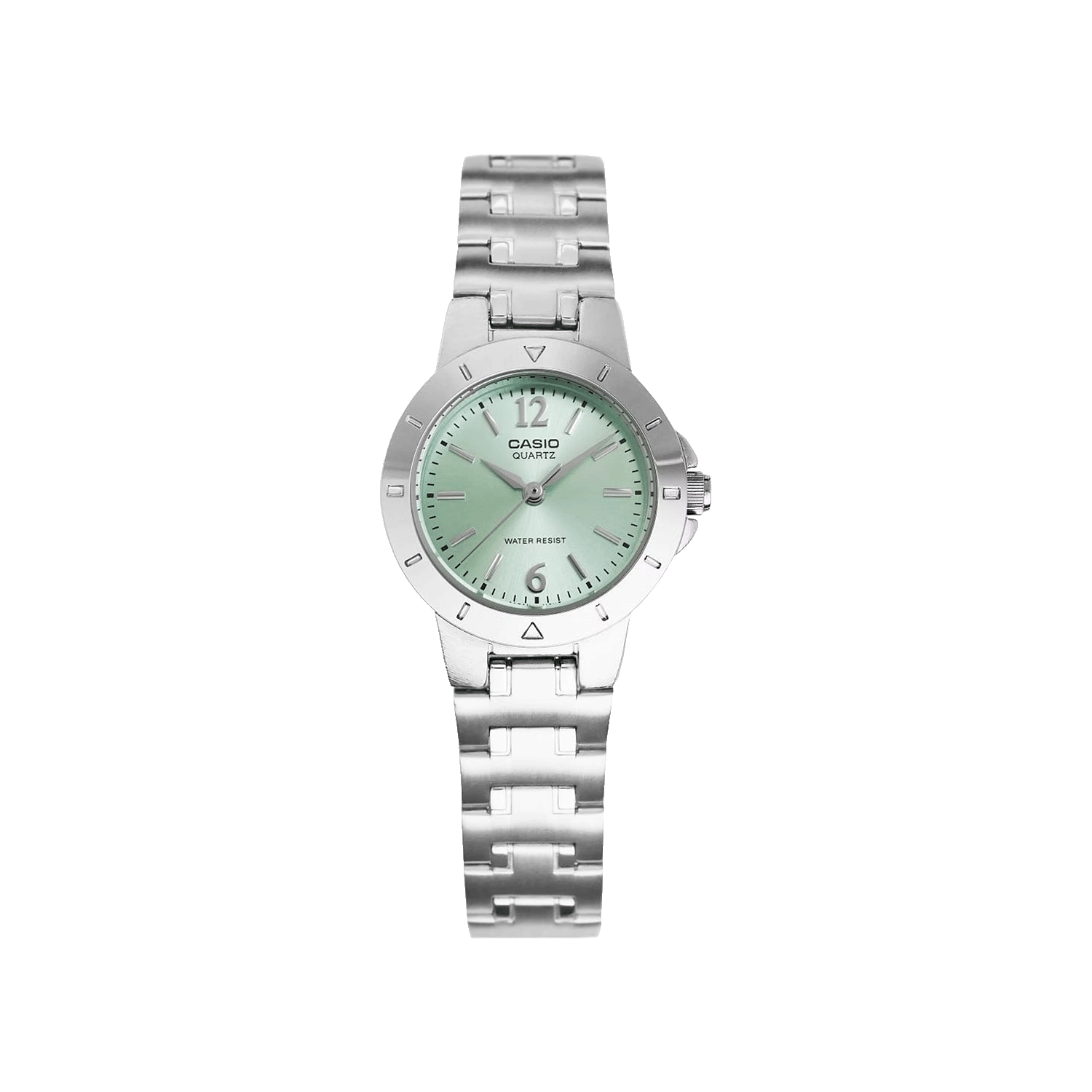 Reloj Casio LTP‑1177A‑3ADF: elegante diseño analógico para mujer con moderna esfera verde y correa de acero inoxidable. Estilo sofisticado y versátil para uso diario.