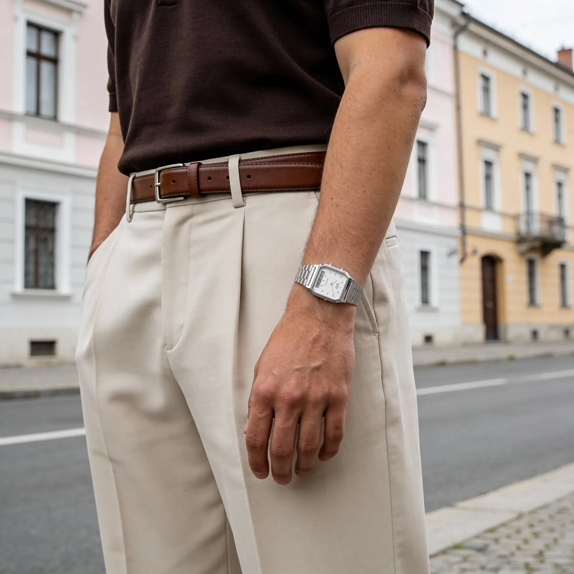 Este modelo destaca por su esfera clara de alta legibilidad con manecillas analógicas y una pantalla digital integrada que muestra información adicional como fecha y alarma. Su estética retro lo hace ideal para quienes buscan un reloj sobrio con personalidad.