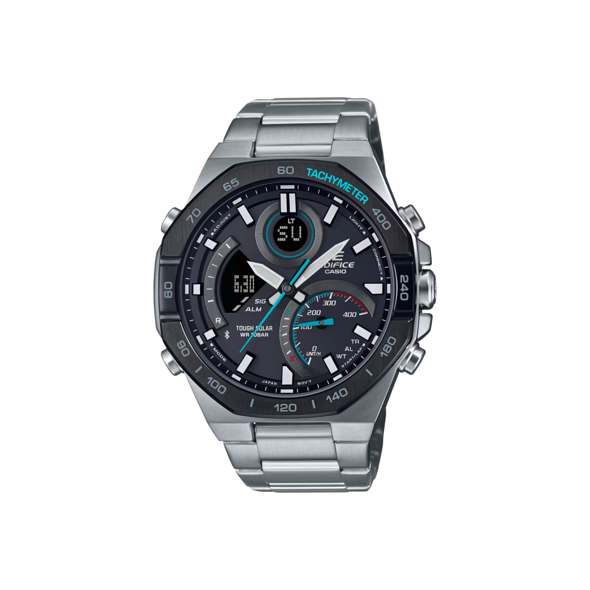 ECB-950DB-1A: energía solar, Bluetooth y cronógrafo en un diseño sofisticado de acero plateado. Precisión y estilo en un solo reloj.
