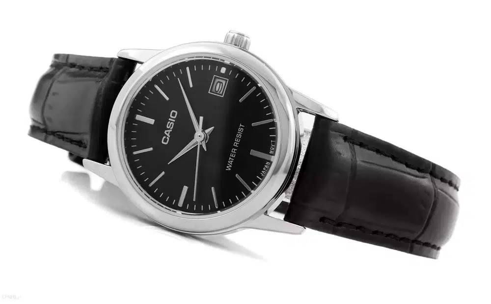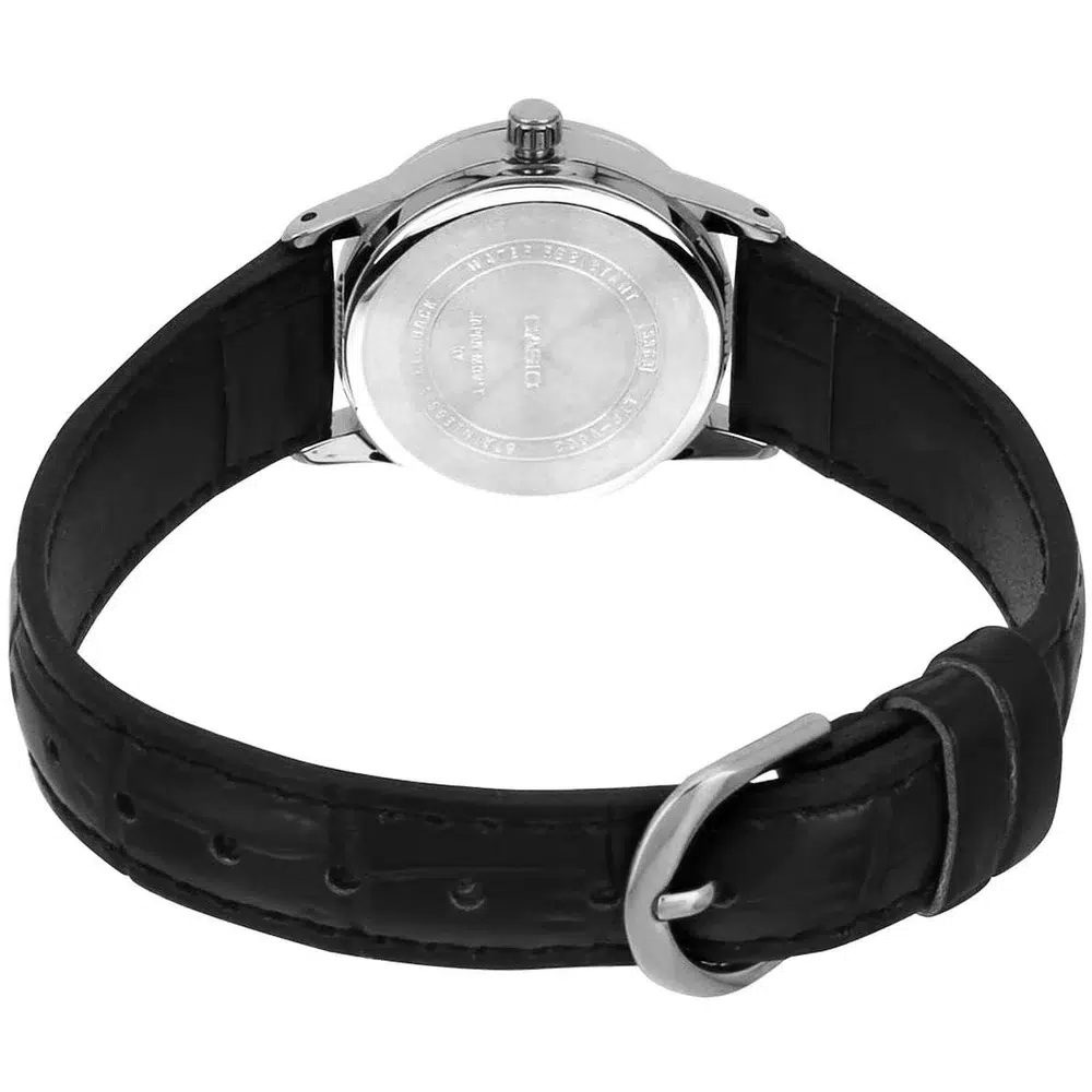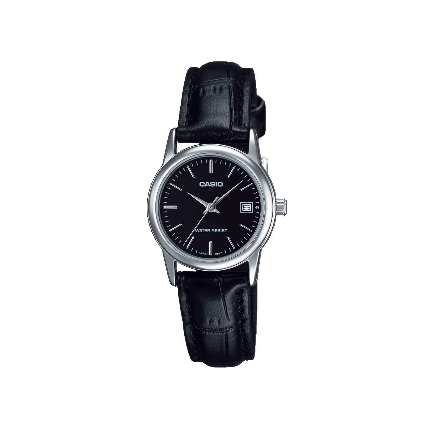 El Casio LTP‑V002L‑1A ofrece un diseño sobrio y elegante, con una sofisticada esfera negra combinada con correa de cuero, ideal para quienes buscan un accesorio versátil y refinado.