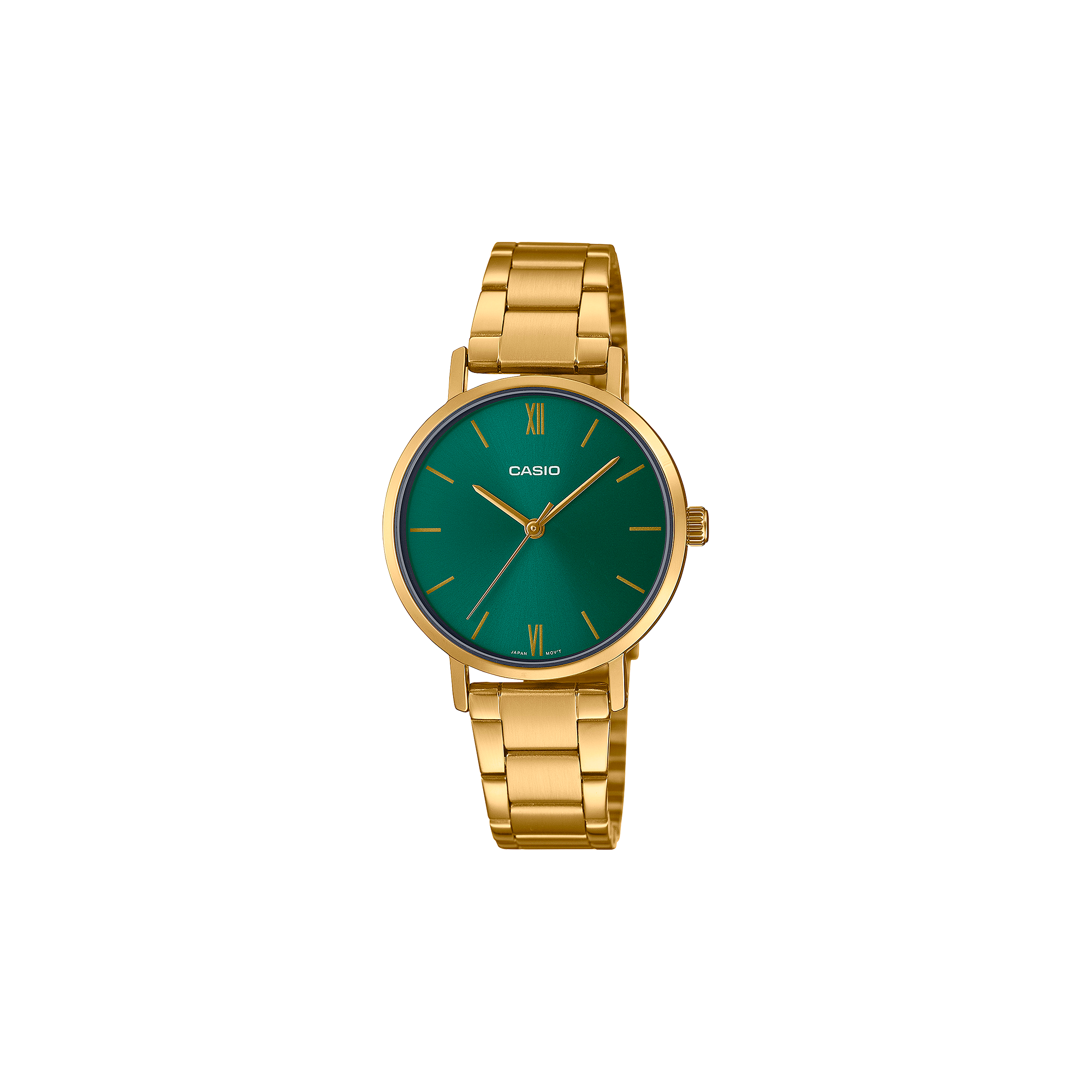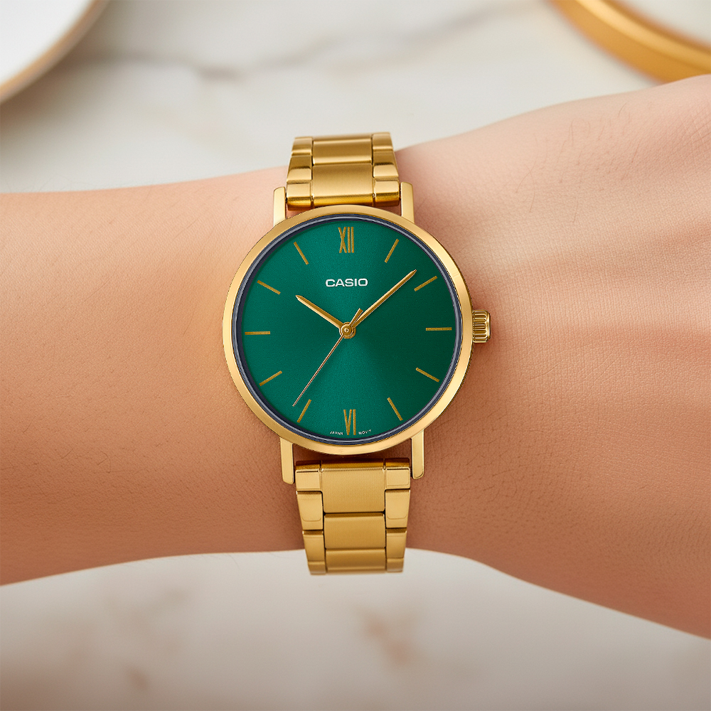 Reloj Casio LTP-VT02G-3AUDF Mujer — Elegante Moderno en Acero Inoxidable Dorado con Esfera Verde