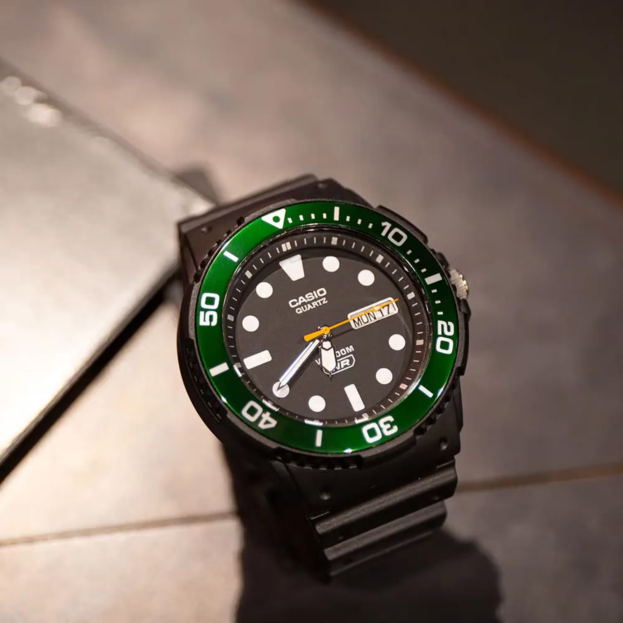 Reloj Casio MRW‑230H‑1E3: modelo analógico deportivo con resistente caja de resina, bisel giratorio en tono verde y alta resistencia al agua. Ideal para actividades al aire libre y uso diario.