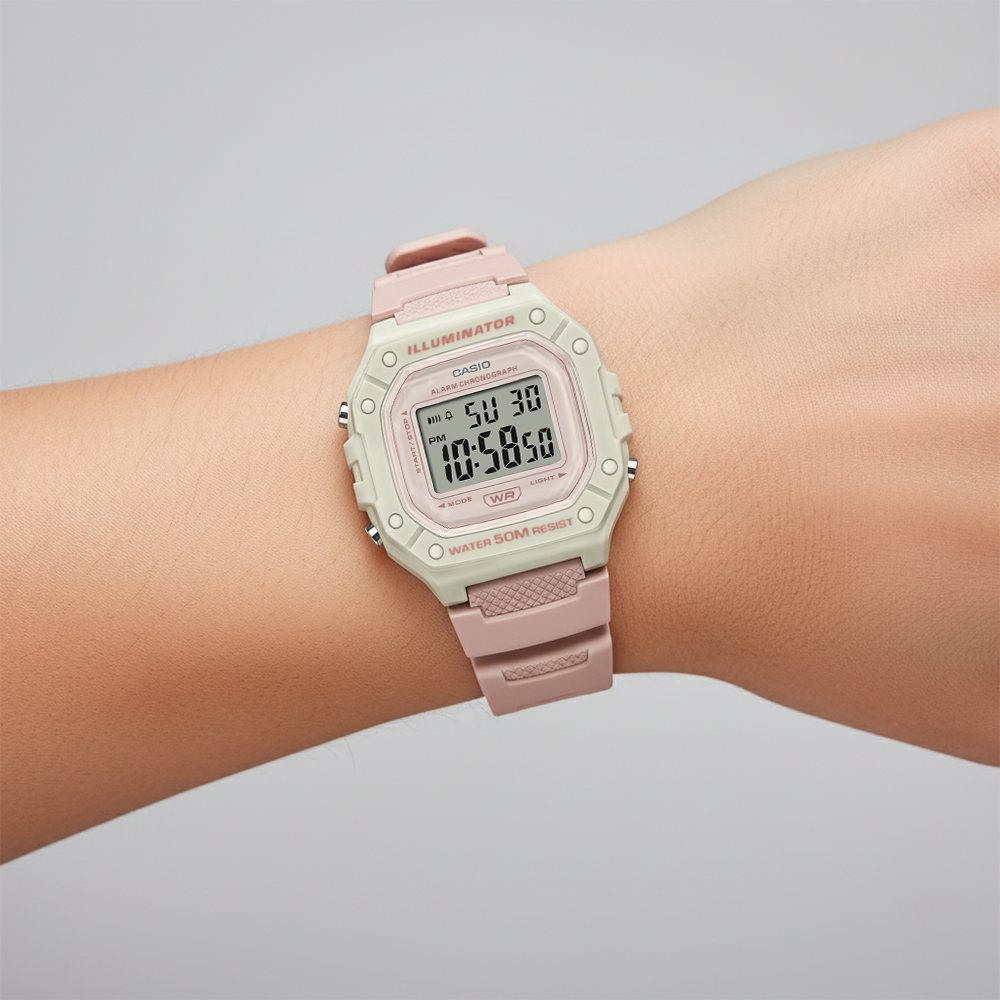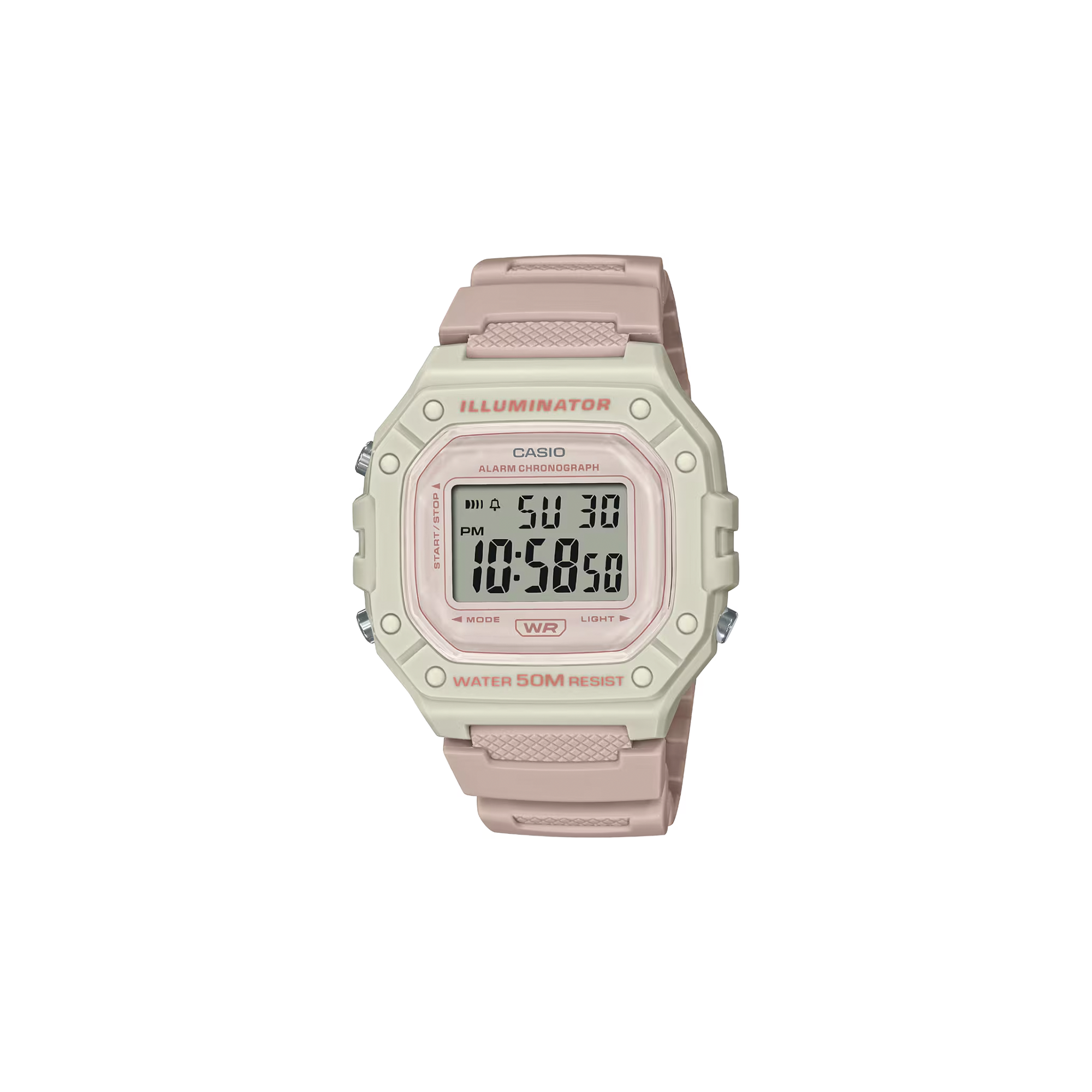 Reloj Casio W-218HC-4A2V Unisex: caja y correa en resina rosa pálido (nude), diseño cuadrado clásico, cronómetro, alarma y luz LED. Resistente al agua 50 m. Perfecto para uso diario con estilo sutil.