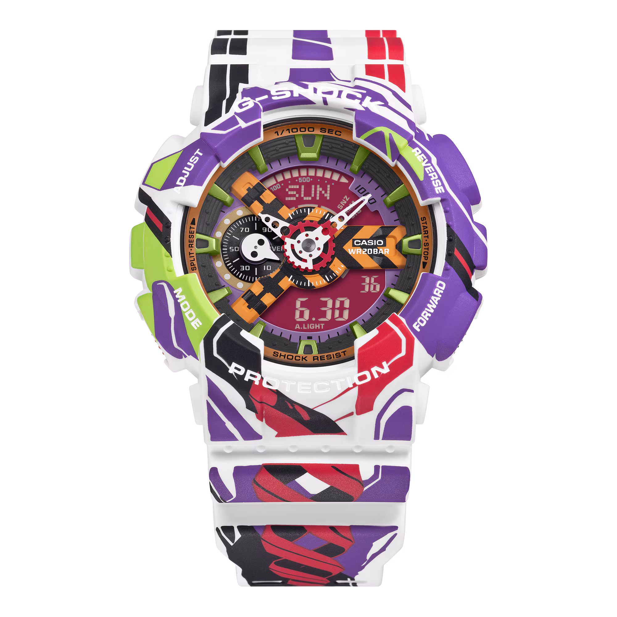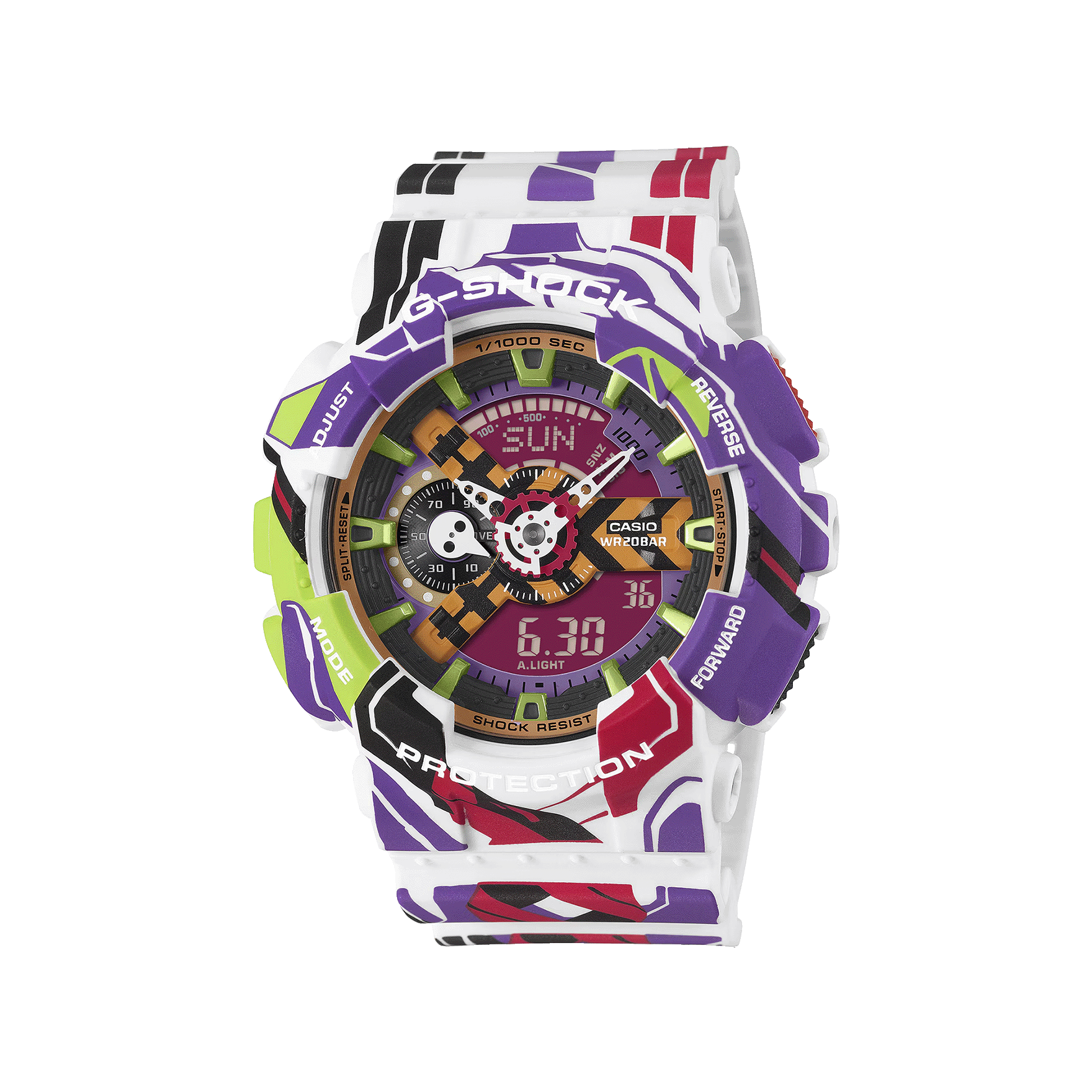 El GA‑110EVA30‑7A es una edición especial creada para celebrar el 30° aniversario de Evangelion. Este modelo combina la resistencia icónica de G‑Shock con un diseño exclusivo inspirado en la estética futurista del anime.