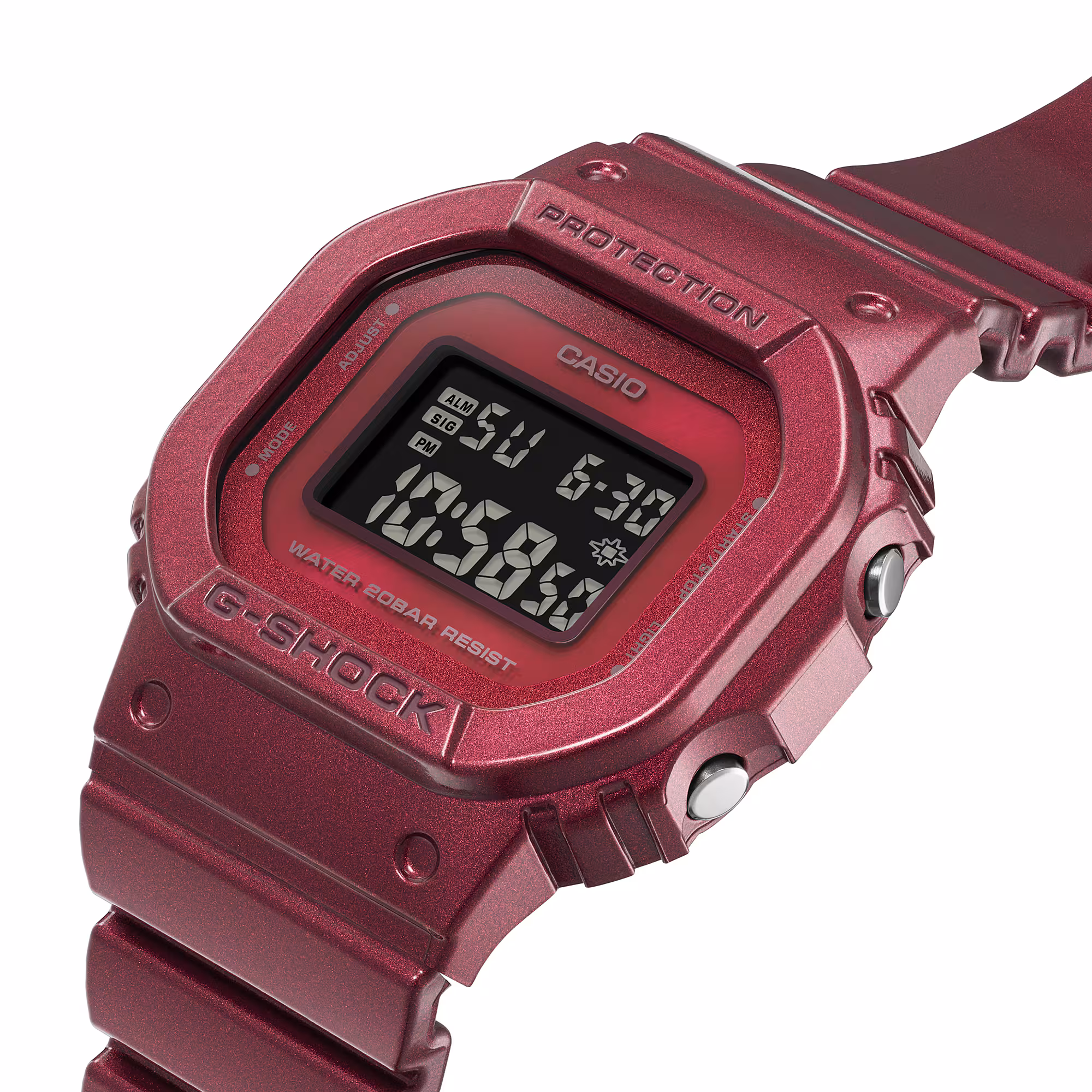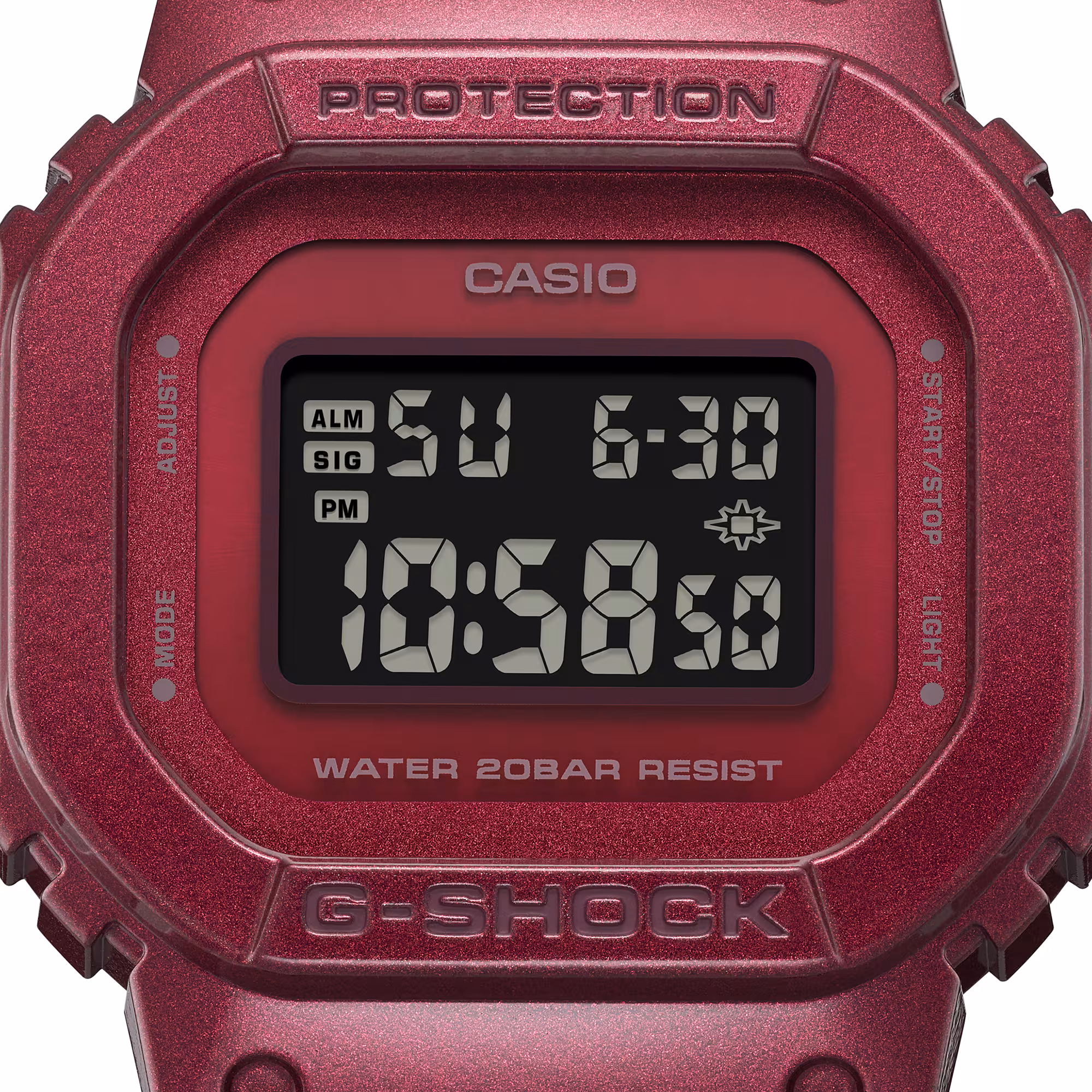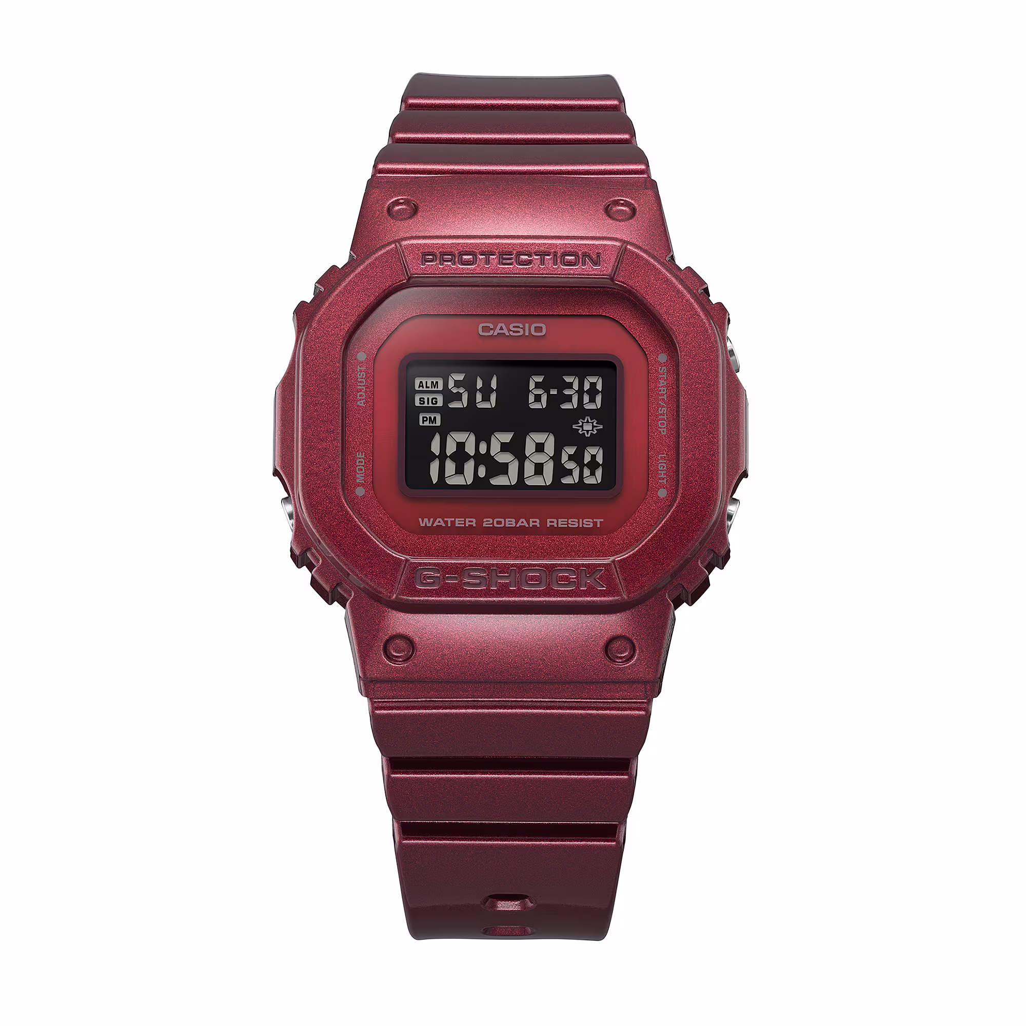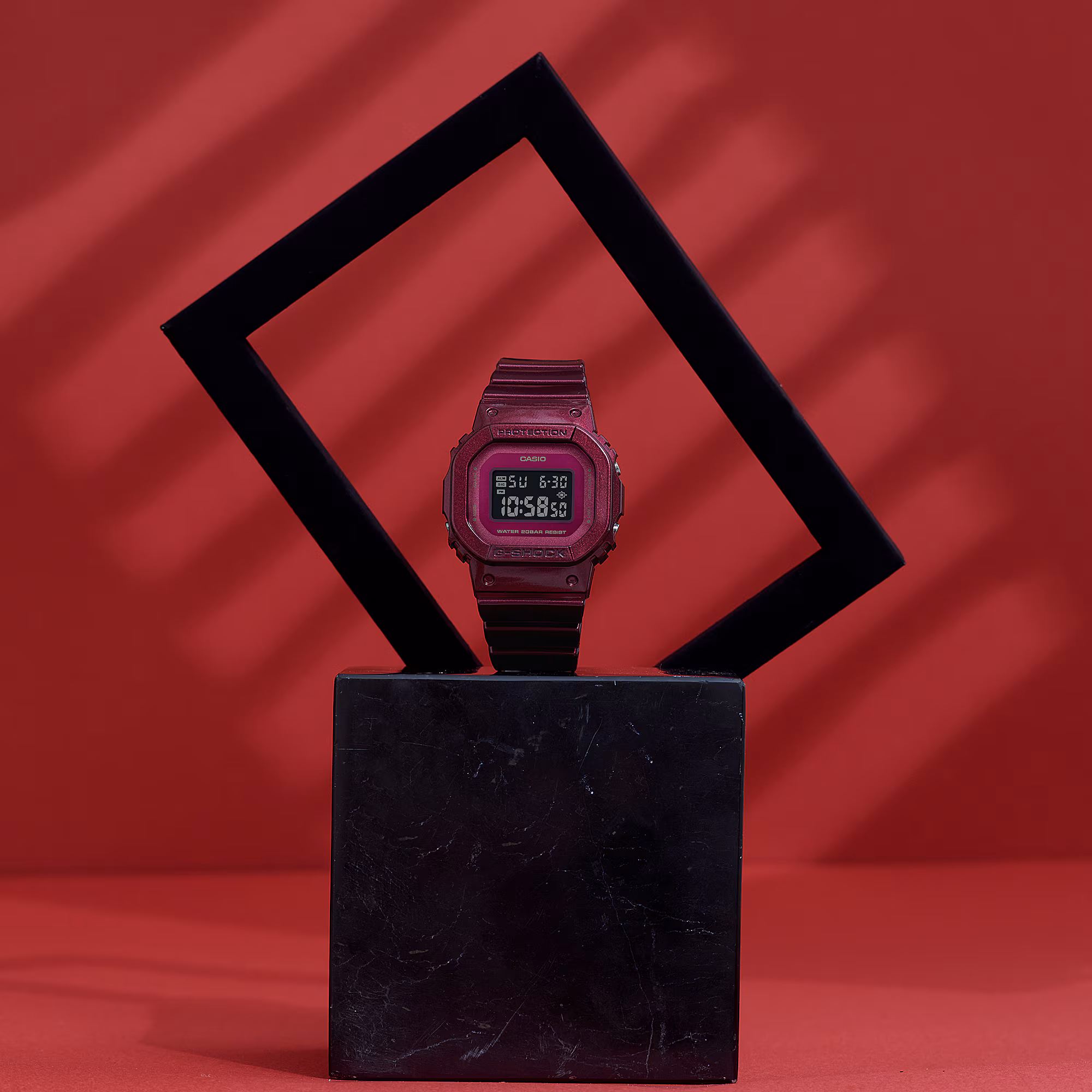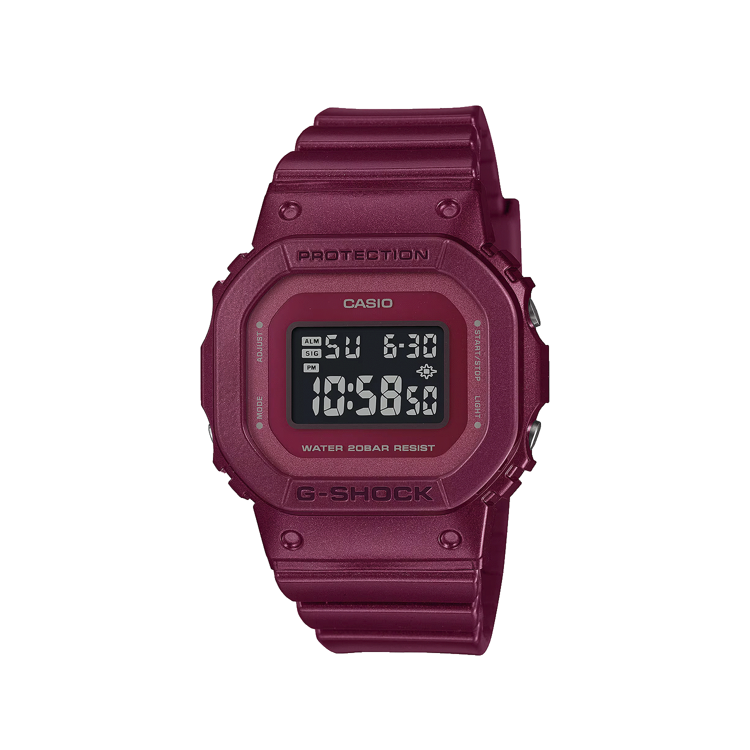 El G‑Shock GMD‑S5600RB‑4DR mantiene la silueta cuadrada clásica de la serie 5600 en un tamaño más compacto, ideal para muñecas femeninas. Su acabado en color rosa aporta un estilo moderno y urbano.
